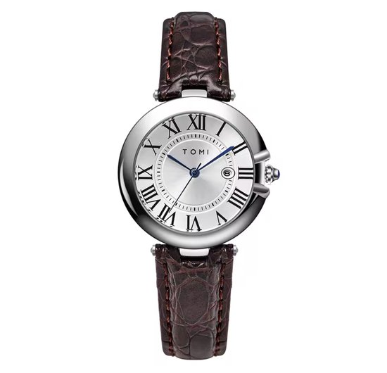 Tomi Horloges Quartz 34mm Zilver Bruine Leren Band Zwarte Wijzerplaat