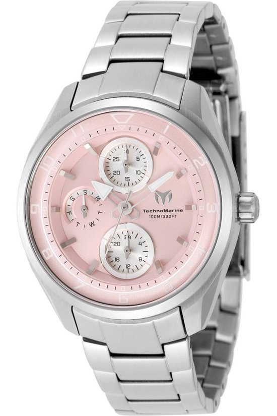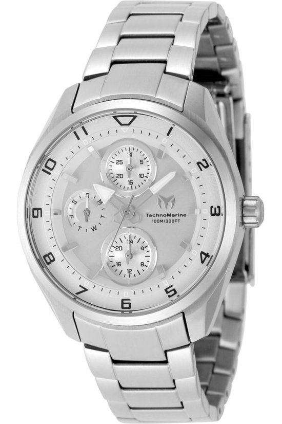 Dameshorloge van TechnoMarine met ronde kast en zilverkleurige band. Uitgevoerd met quartz uurwerk, 40 mm kastdiameter en waterdicht tot 20 ATM.