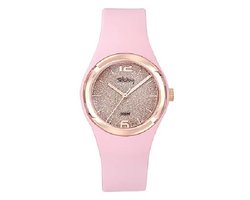 Dameshorloge van onbekend merk met ronde rozekleurige kast en onbekende band. Uitgevoerd met quartz uurwerk, 33mm kastdiameter en waterdicht tot 10 ATM.