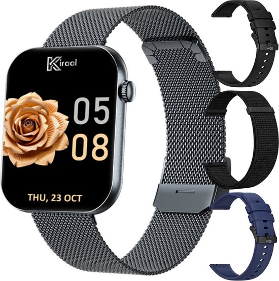 Kiraal Aura Smartwatch 44mm Zwart RVS met 4 Bandjes