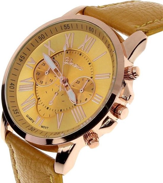 Dameshorloge van onbekend merk met ronde okergele kast en leren band. Uitgevoerd met quartz uurwerk, kastdiameter onbekend en waterdicht tot 5 ATM.